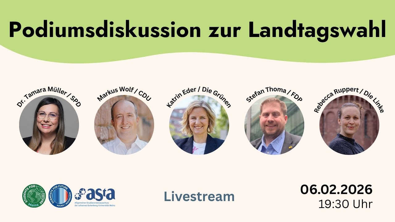 Für dieanstehende Landtagswahl veranstalten die Scientists for Future Mainz gemeinsam mit den Students for Future Mainz eine Podiumsdiskussion mit den Schwerpunkten Nachhaltigkeit, Klima- und Umweltschutz. Die Veranstaltung wird mit Untersütztung der Lehr- und Ausbildungsredaktion von OKTV Mainz live im Programm und auf YouTube übertragen.