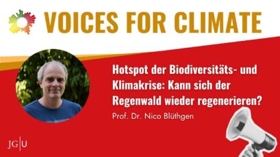 VOICES FOR CLIMATE ist die Vorlesungsreihe über die Klimakrise an der JGU. Spannend und interdisziplinär betrachten wir die Klimakrise aus verschiedensten Perspektiven, von den Naturwissenschaften, über die Geistes- und Sozialwissenschaften bis zu Musik, Theologie und vielen mehr. Das Besondere dabei? Wir schauen nicht nur auf den Status Quo, sondern wir setzen uns auch mit dem jetzt notwendigen Handeln auseinander.